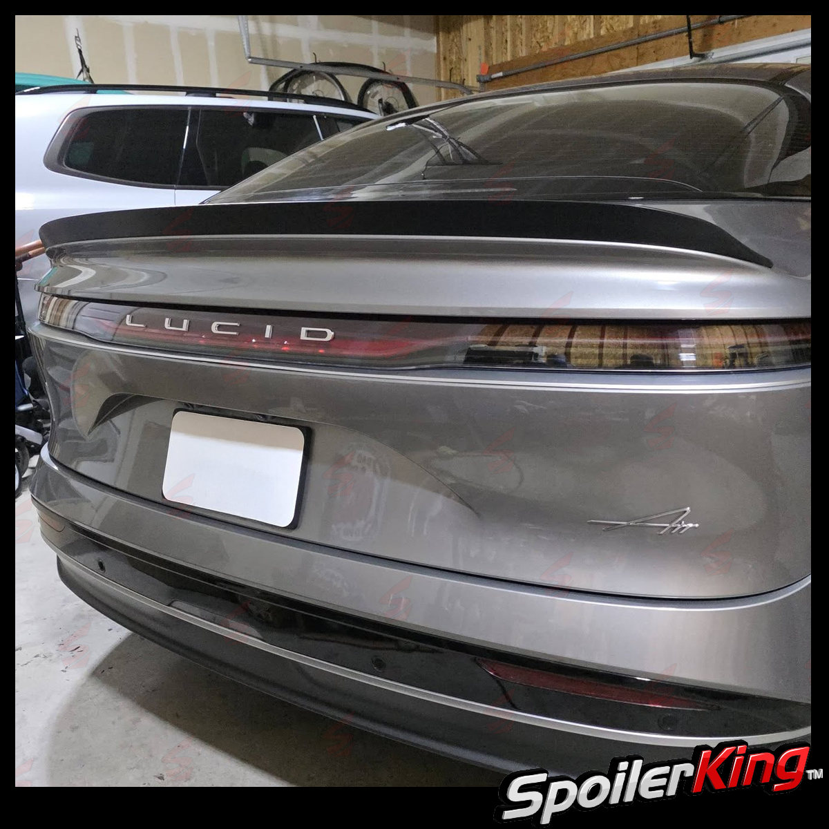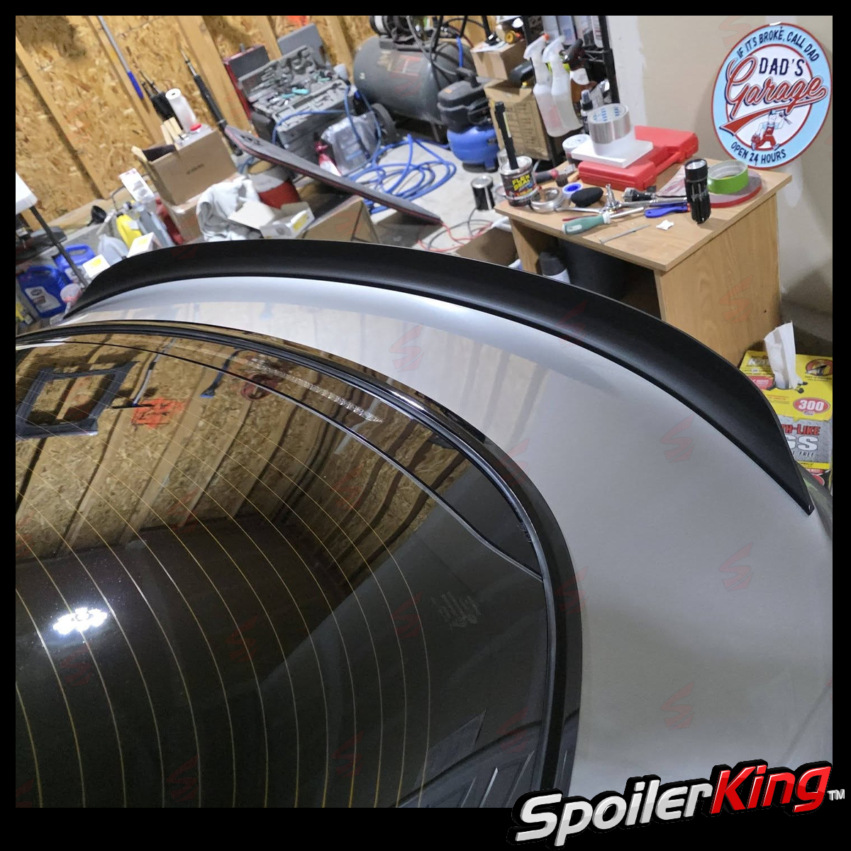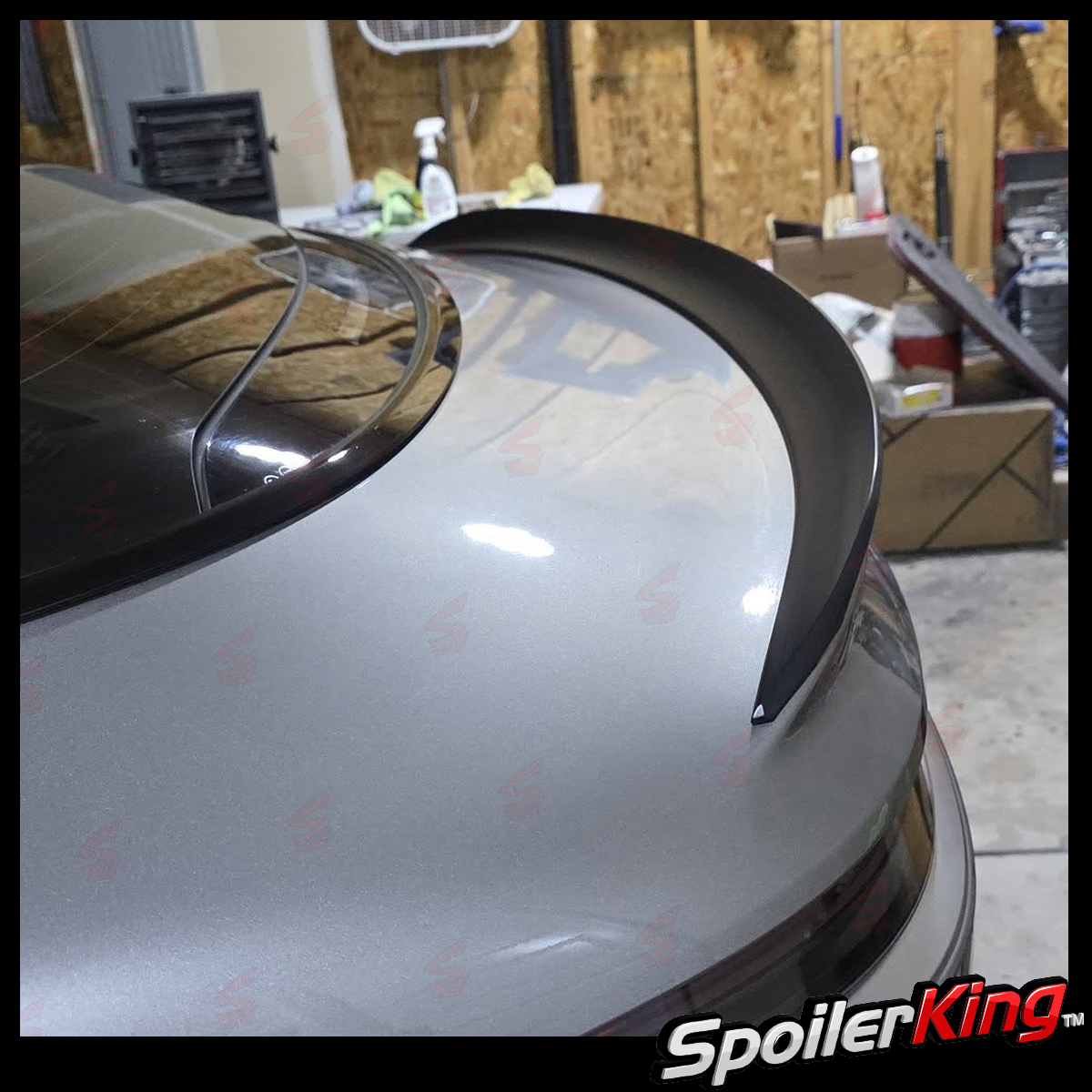 This curved trunk spoiler design measures at 2 5/8" wide & 1 5/8" high. Spoiler is made from high quality polyurethane material and will sit flush against the edge of the trunk of the vehicle. It includes self adhesive tape for easy installation. Spoiler is UNPAINTED with a flat black finish. Painting will require flex paint to be used. All Spoilers are aftermarket and manufactured in the USA.